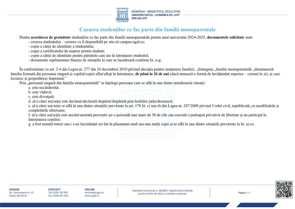 În urmatoarele imagini o sa regăsiți informații cu privire la documentele de care aveți nevoie, în cazul în care proveniți din familii monoparentale, cât și orarul cazărilor.