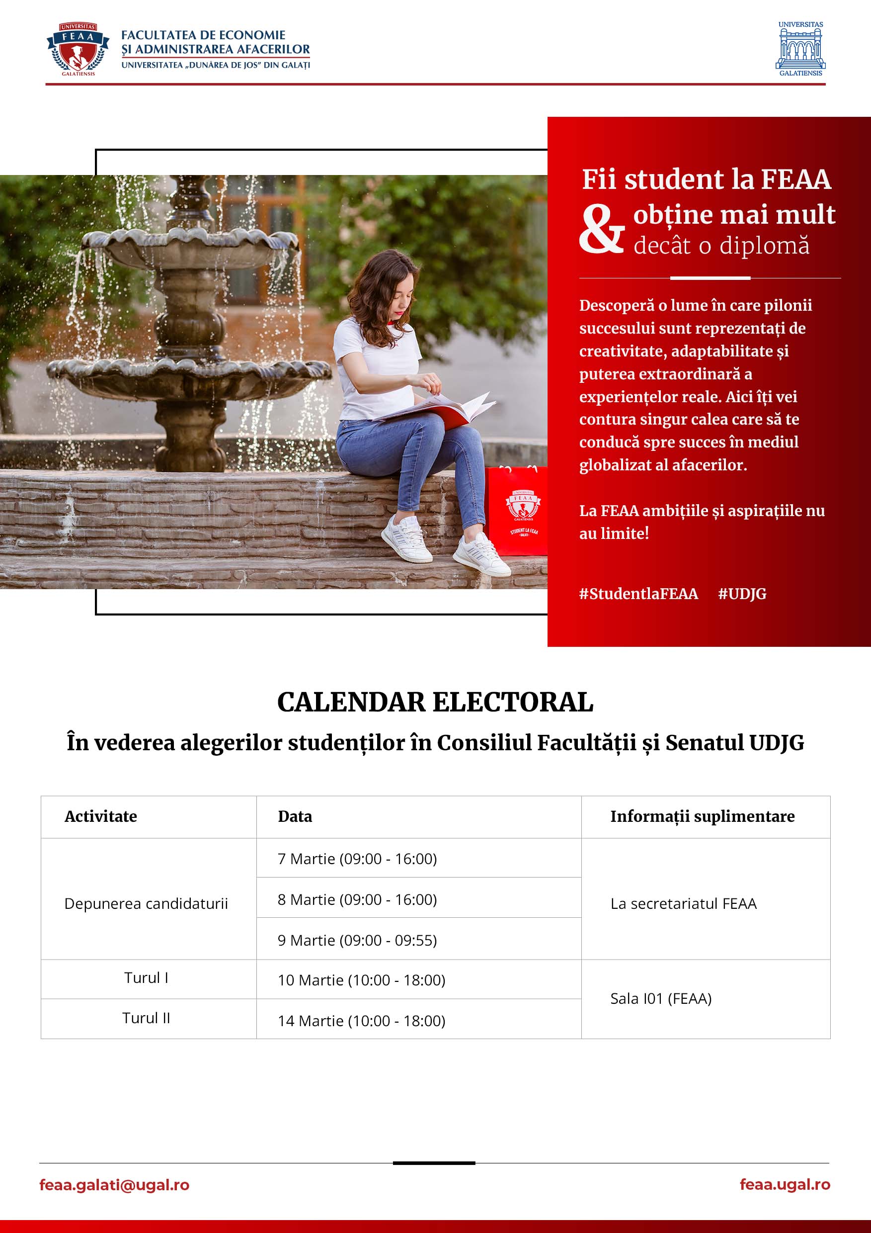 In perioada 7-14 martie (după cum se observă în calendarul de mai jos) se vor desfășura alegerile pentru punerea în funcție a studenților FEAA in