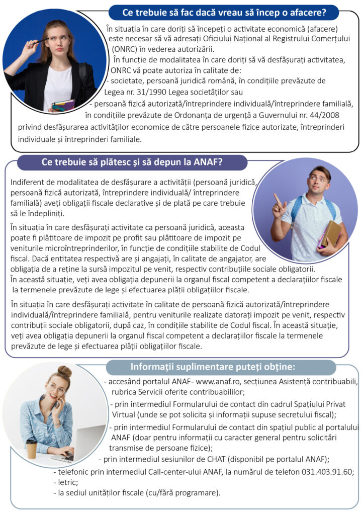 Întâlnirea a avut ca scop clarificarea procedurilor și a obligațiilor fiscale, esențiale pentru orice viitor antreprenor sau profesionist. Specialiștii ANAF au ghidat audiența prin etapele necesare pentru inițierea unei activități economice, de la momentul conceptual la autorizarea oficială la Oficiul Național al Registrului Comerțului (ONRC).